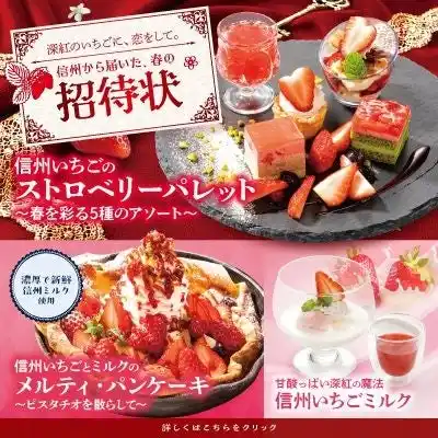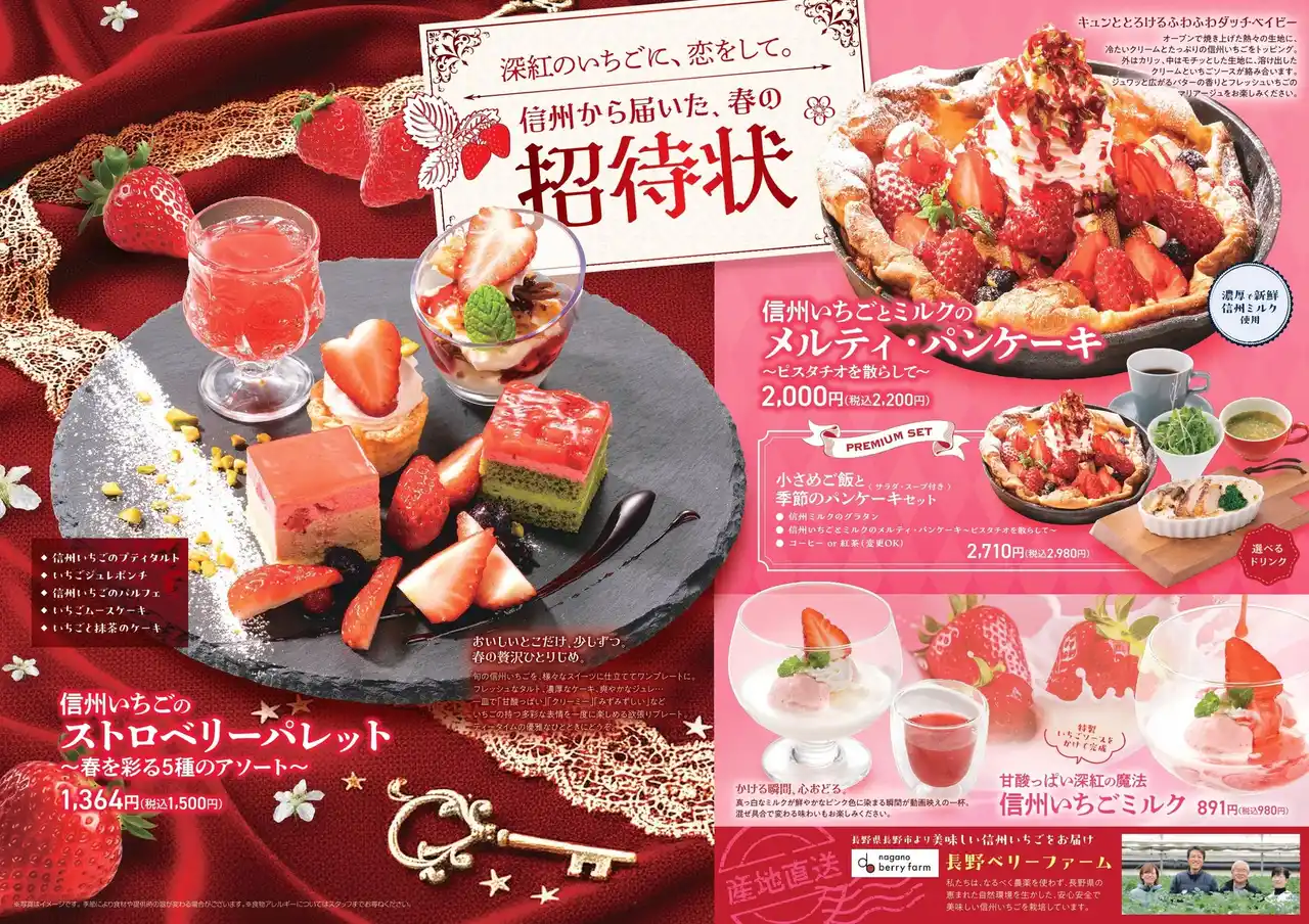 | A. 「深紅のいちごに、恋をして。」という言葉の通り、一口食べれば心ときめくような、甘酸っぱい深紅の魔法 を準備してお待ちしております。フレッシュな信州いちごと濃厚なミルクが織りなす極上のスイーツで、春の訪れを存分にお楽しみください。 | |||||||||||||||||||