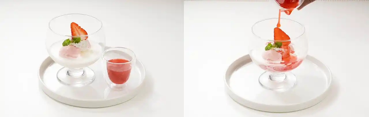 | お客様ご自身でいちごソースをかけて仕上げていただく、エンターテインメント性あふれる一杯です。真っ白なミルクが鮮やかなピンク色に染まる瞬間は、まさに「動画映え」間違いなし 。混ぜ具合によって変わる味わいの変化も、ぜひお楽しみください 。 | |||||||||||||||||||