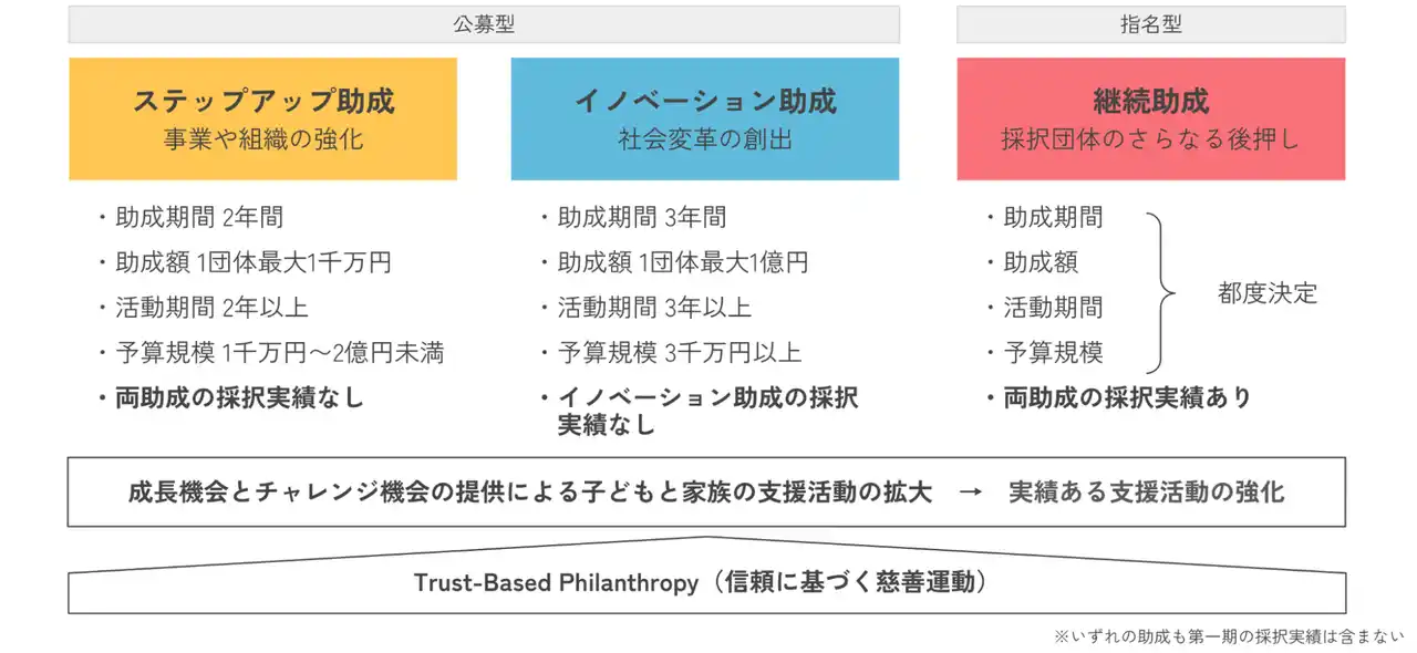 子どもやその家族を取り巻く社会課題の解決に向けて活動する団体に対し、資金の提供および助成先団体の活動支援を行っています。 |