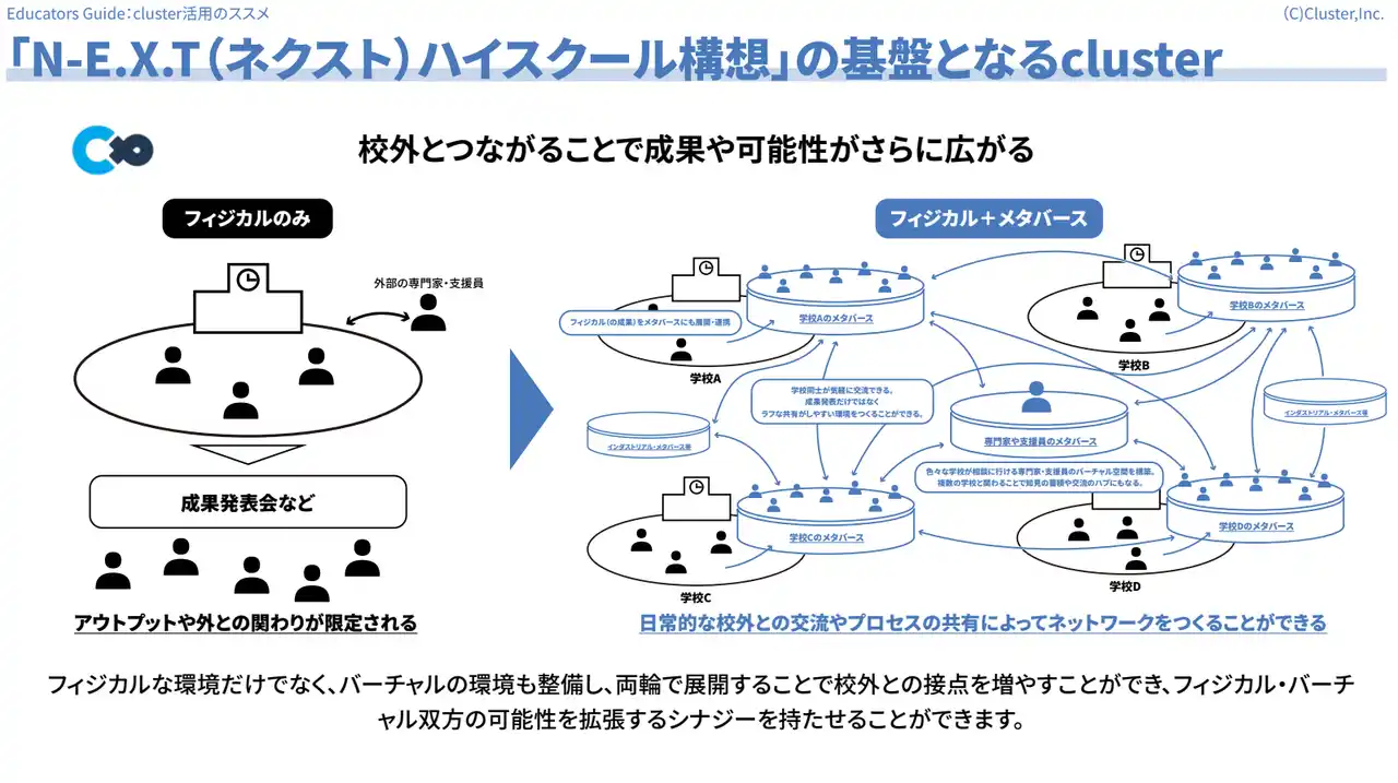 「N-E.X.T(ネクスト)ハイスクール構想」の基盤となるcluster:文部科学省が推進する「N-E.X.T(ネクスト)ハイスクール構想」。本資料では、「N-E.X.T(ネクスト)ハイスクール構想」においてclusterがどのような効果を発揮するのか、clusterを活用した新しい高校の姿のイメージを紹介 |