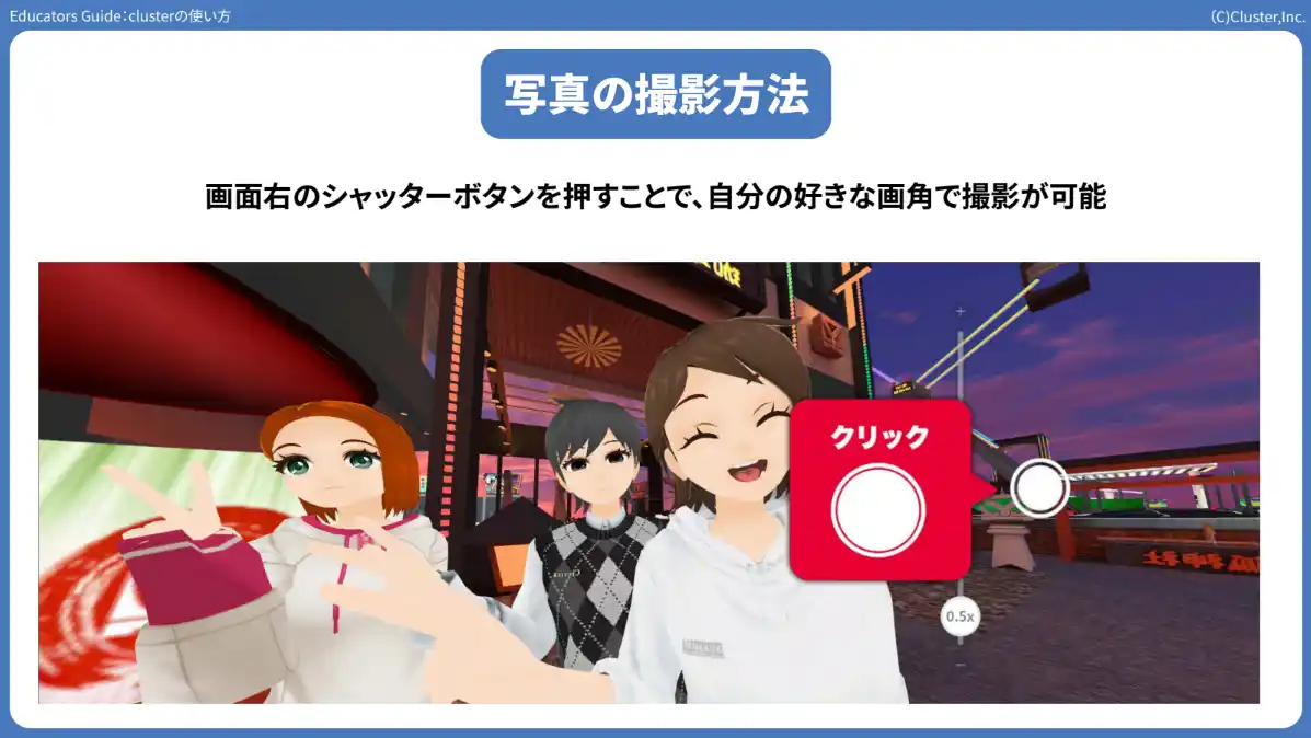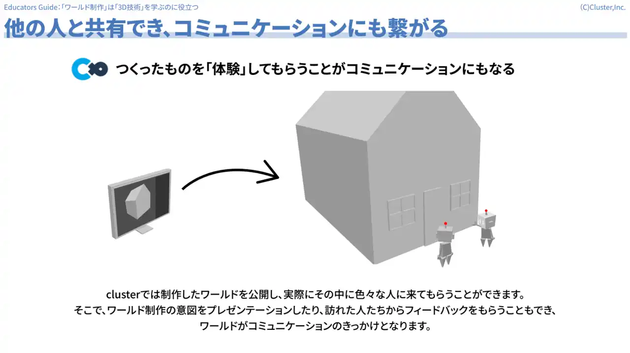 本ガイドは、授業や講義でそのまま使えるスライド形式の教育者向け教材です。「メタバースとは何か」という基礎的な説明から、clusterの操作方法、3D空間の制作まで、 |