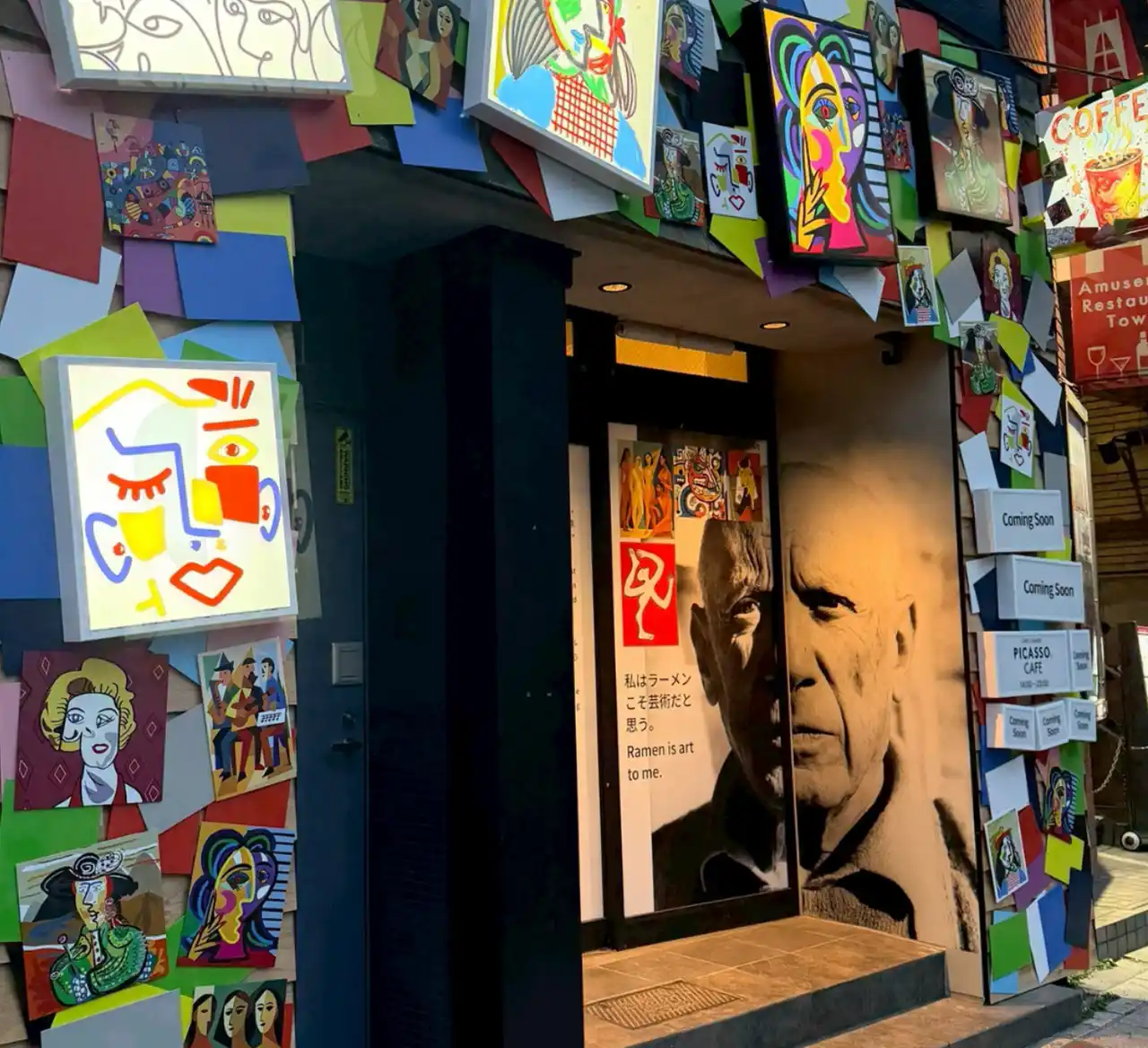 世界的巨匠パブロ・ピカソのインスパイアアートと、大阪で週末50人以上の行列を作り続ける「人類みな麺類」の革新性が融合した新業態のカフェです。店内には様々なアート作品が飾られ、店内中央には本格的なDJブースもあり、アートに囲まれた空間で様々なカフェフードやドリンクに加えて本格的なラーメンをお楽しみいただけます。 |