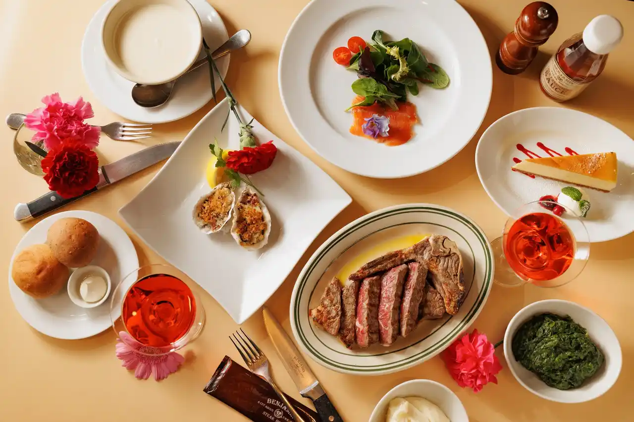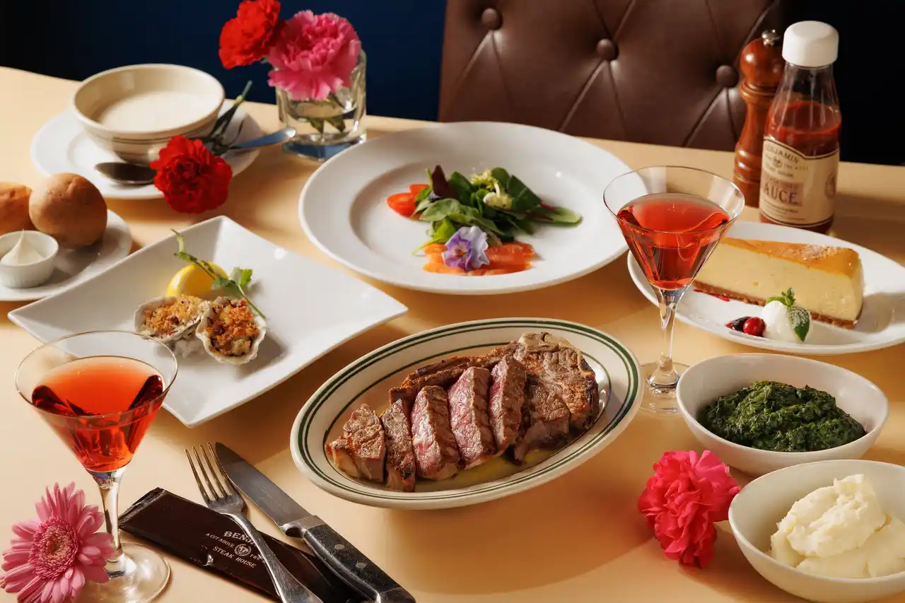 前菜には、彩り豊かなメスクランサラダとサーモンマリネを組み合わせた「母の日オリジナル前菜盛り合わせ」をご用意。メインには、USDA認定プライムビーフを使用した「フィレミニョンステーキ」や、28日間熟成で旨味を引き出した「USDAプライムNYサーロインステーキ」など、ベンジャミン ステーキハウスならではの魅力を堪能できるラインナップを揃えています。 |