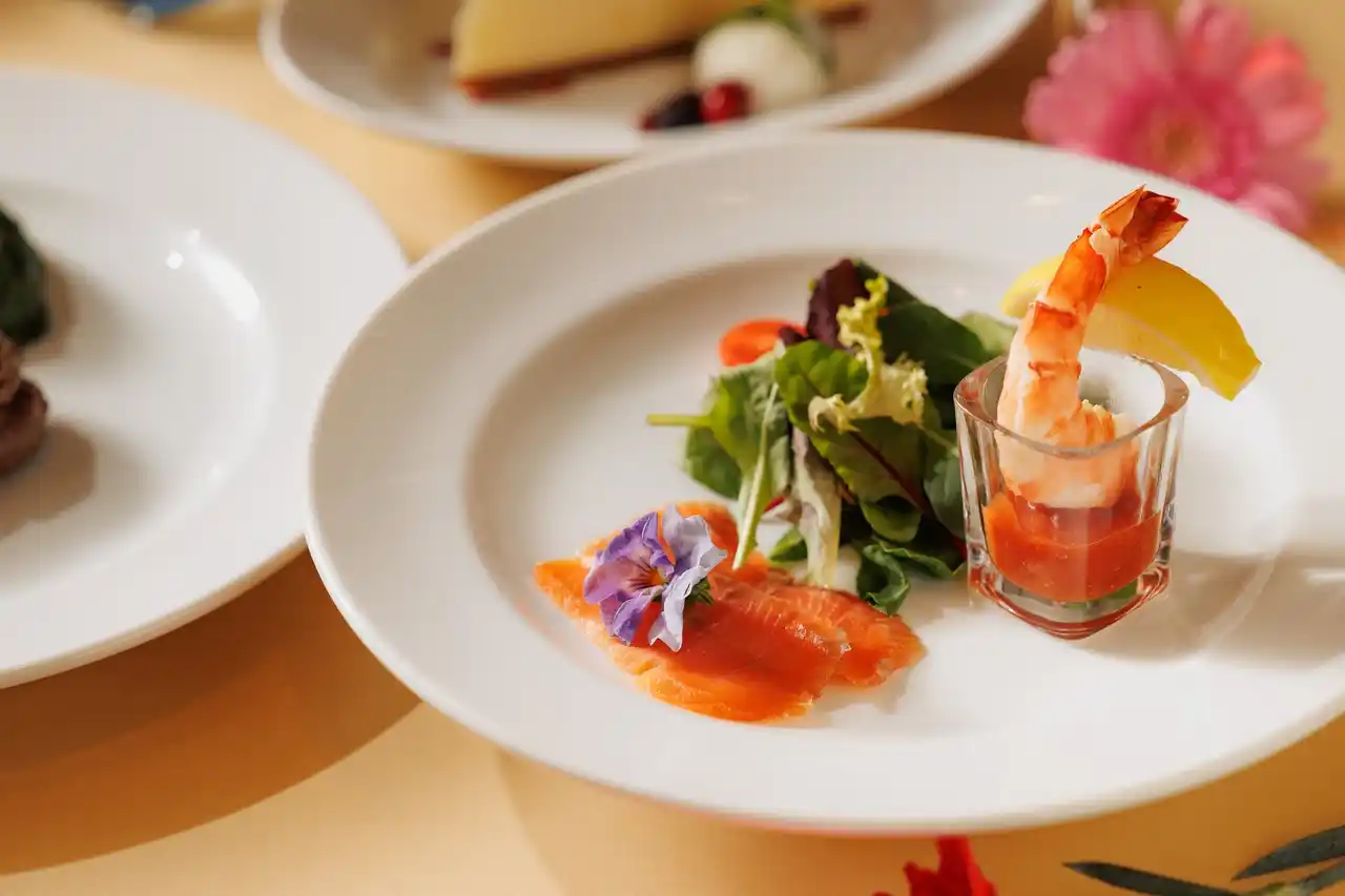 「母の日フィレミニョンコース」には、「母の日オリジナル前菜盛り合わせ」にプリッとした海老の食感と爽やかな酸味が、フィレミニョンの上品な甘みが特徴のシュリンプカクテルを添えて提供します。 |