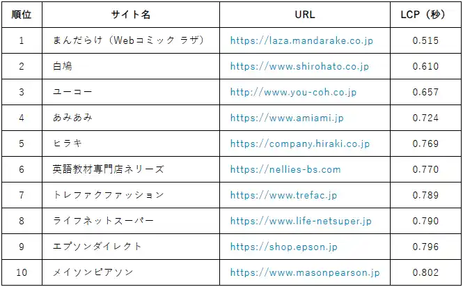 1位「まんだらけ」はLCP 0.515秒・TTFB 0.138秒という驚異的な数値を記録。トップ5はすべて0.8秒未満で、表示速度の最適な状態と言えます。前月2位だった「白鳩」は今月も0.610秒で2位を維持し、「ユーコー」「あみあみ」「ヒラキ」「エプソンダイレクト」といった常連サイトとともに、安定した高パフォーマンスを継続しています。 |