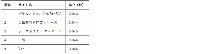 INPのトップ5では、グラムスタイル公式BtoB卸(0.043秒)が最速を記録。注目すべきは2位の「英語教材専門店ネリーズ」と4位の「白鳩」で、両サイトともLCPランキングでも上位(6位・2位)に位置しており、読み込み速度とインタラクション応答性の両面で極めて高い水準を実現しています。 |