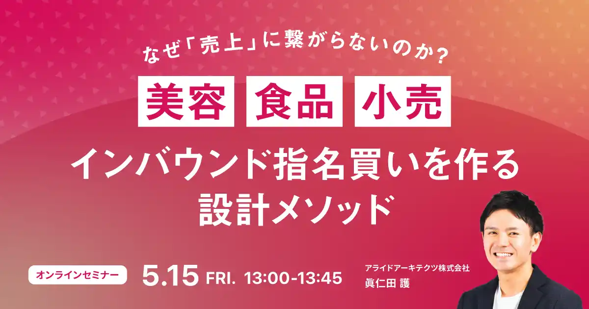データとクリエイティブの力でマーケティングコミュニケーションを設計し、企業のマーケティングAXを支援するアライドアーキテクツ株式会社(本社:東京都渋谷区、取締役社長:村岡弥真人、証券コード:6081、以下「当社」)は、5月15日(金)に無料オンラインセミナー「なぜ売上に繋がらないのか?美容・食品・小売のインバウンド指名買いを作る設計メソッド」を開催いたします。 |