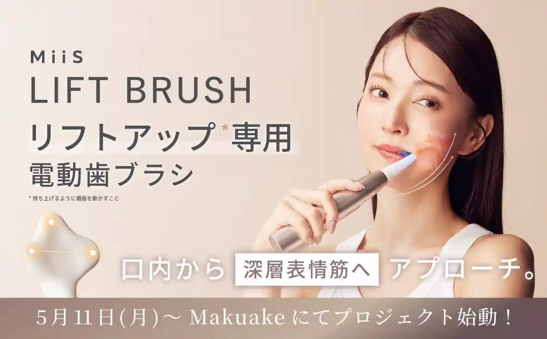 株式会社MUSCAT GROUP(本社:東京都渋谷区、代表取締役:大久保 遼、証券コード:195A)の連結子会社で、「WinK TO COMMUNITY」をミッションに、心躍るプロダクト・サービスを創出する株式会社WinC(本社:東京都渋谷区、代表取締役:荻原 萌々佳、以下「当社」)が展開するオーラル美容ブランド「MiiS(ミーズ)」は、口腔内から表情筋へアプローチする新発想の電動歯ブラシ「MiiS LIFT BRUSH(ミーズ リフト ブラシ)」を2026年5月11日(月)より、アタラシイものや体験の応援購入サービス「Makuake」にて販売開始いたします。 |