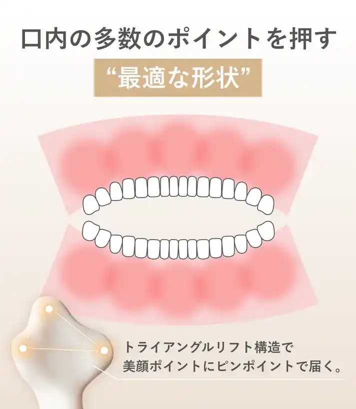 外側からは届きにくい表情筋(咬筋など)を口腔内から直接刺激できるよう、計算し尽くした独自の「トライアングルリフト構造」を設計。歯科医の知見に基づき、口角やほうれい線まわりへ本質的なアプローチを叶えます。 |