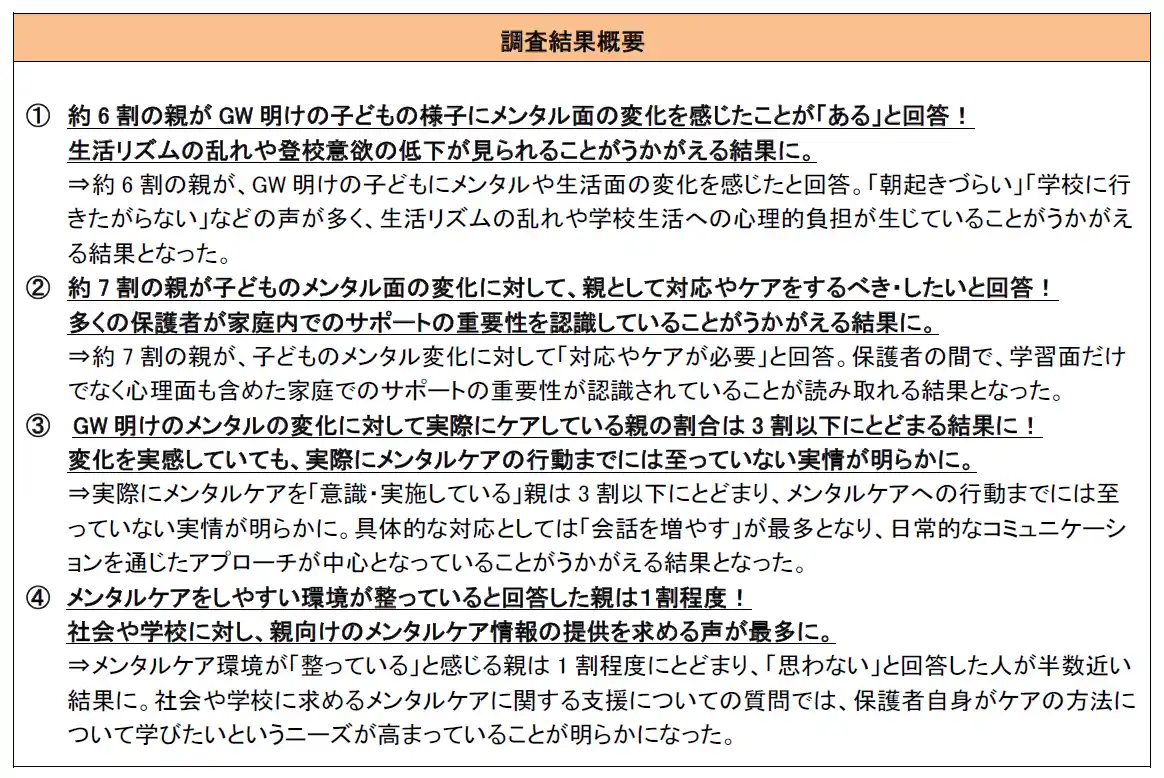 その結果、約6割の親がGW明けに子どもの「やる気低下」を感じる一方で、実際にケアを行っている親は3割以下となり、行動までには至っていない実情が明らかになりました。ケアをしやすい環境が整っていないと感じる親も多く、特に社会や学校に対して「親向けのメンタルケア情報の提供」を求める声が多数を占め、保護者自身がケアの方法について学びたいというニーズが高まっていることが明らかになりました。 |