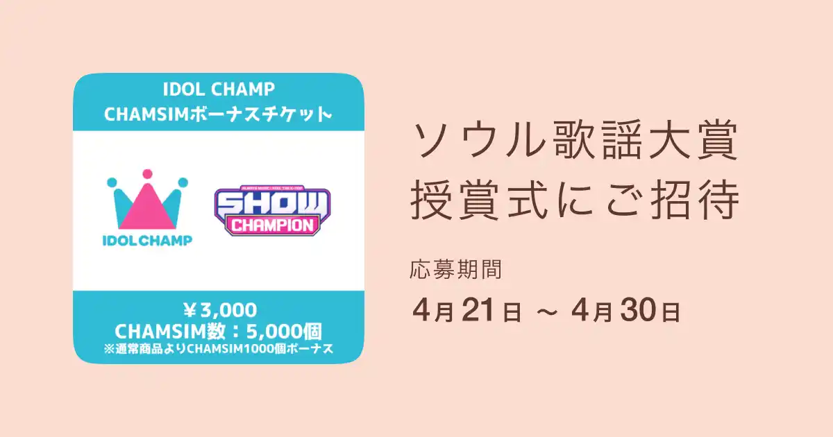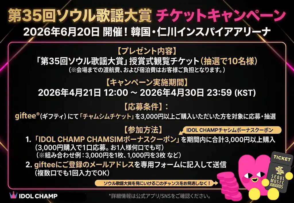 | K-POPアイドルファンダムアプリ「IDOL CHAMP」は、eギフトプラットフォーム事業を展開する株式会社ギフティが運営するeギフト販売サービス「giftee(R)」において、「第35回ソウル歌謡大賞」の授賞式観覧チケットが抽選で10名様に当たるプレゼントキャンペーンを、2026年4月21日(火)より開始いたします。 | ||||||||||||||||||||||