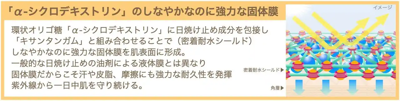 *1 日焼け止め成分を肌上で固体膜にする技術(クリーム剤型) *2 シクロデキストリン、キサンタンガム、t-ブチルメトキシジベンゾイルメタン、ホモサレート、オクトクリレン、サリチル酸エチルヘキシル *3 ナイアシンアミド、3-O-エチルアスコルビン酸、グリチルレチン酸ステアリル、カミツレ花エキス、セイヨウオトギリソウ花/葉/茎エキス、トウキンセンカ花エキス、フユボダイジュ花エキス、ヤグルマギク花エキス、ローマカミツレ花エキス |