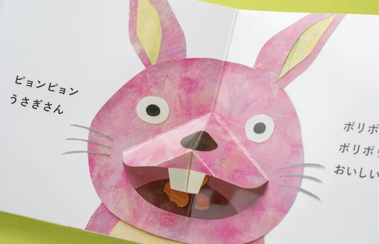 ページを開け閉めすると、ポップアップのしかけで、どうぶつたちの口がモグモグ、ムシャムシャと動きます。何度も繰り返して遊べ、親子での読み聞かせにもぴったりです。 |