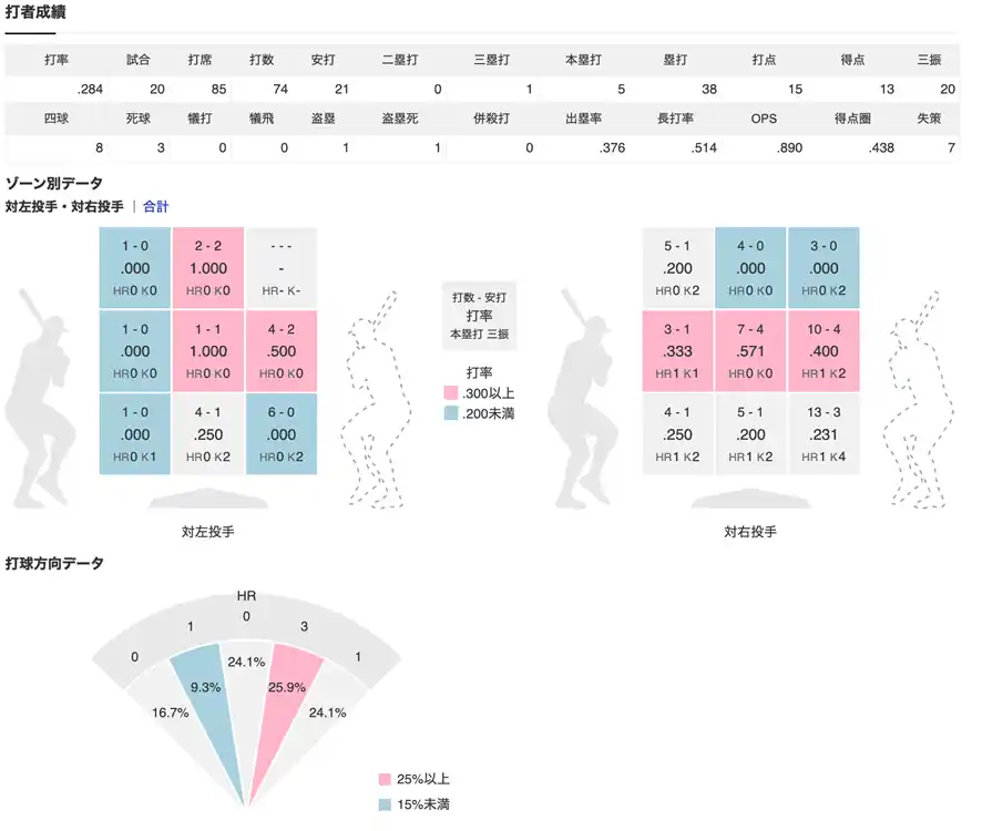 打撃データでは、9分割のゾーン別の打率や本塁打、三振数が確認できます。さらに、打球方向データでは、グラウンドを5分割した打球方向の割合やホームランを分かりやすいグラフで表示します。打者の得意・不得意なコースや、どの方向に打球を飛ばす傾向があるのかをデータに基づき深く知ることができます。 |
