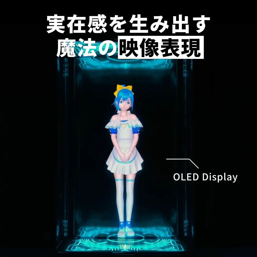 Gatebox3では、キャラクターの魅力を極限まで引き出すためにOLEDディスプレイを採用し、OLEDによる漆黒の空間によって、キャラクターが本当にそこに”居る”と感じるような実在感を作り出します。 |
