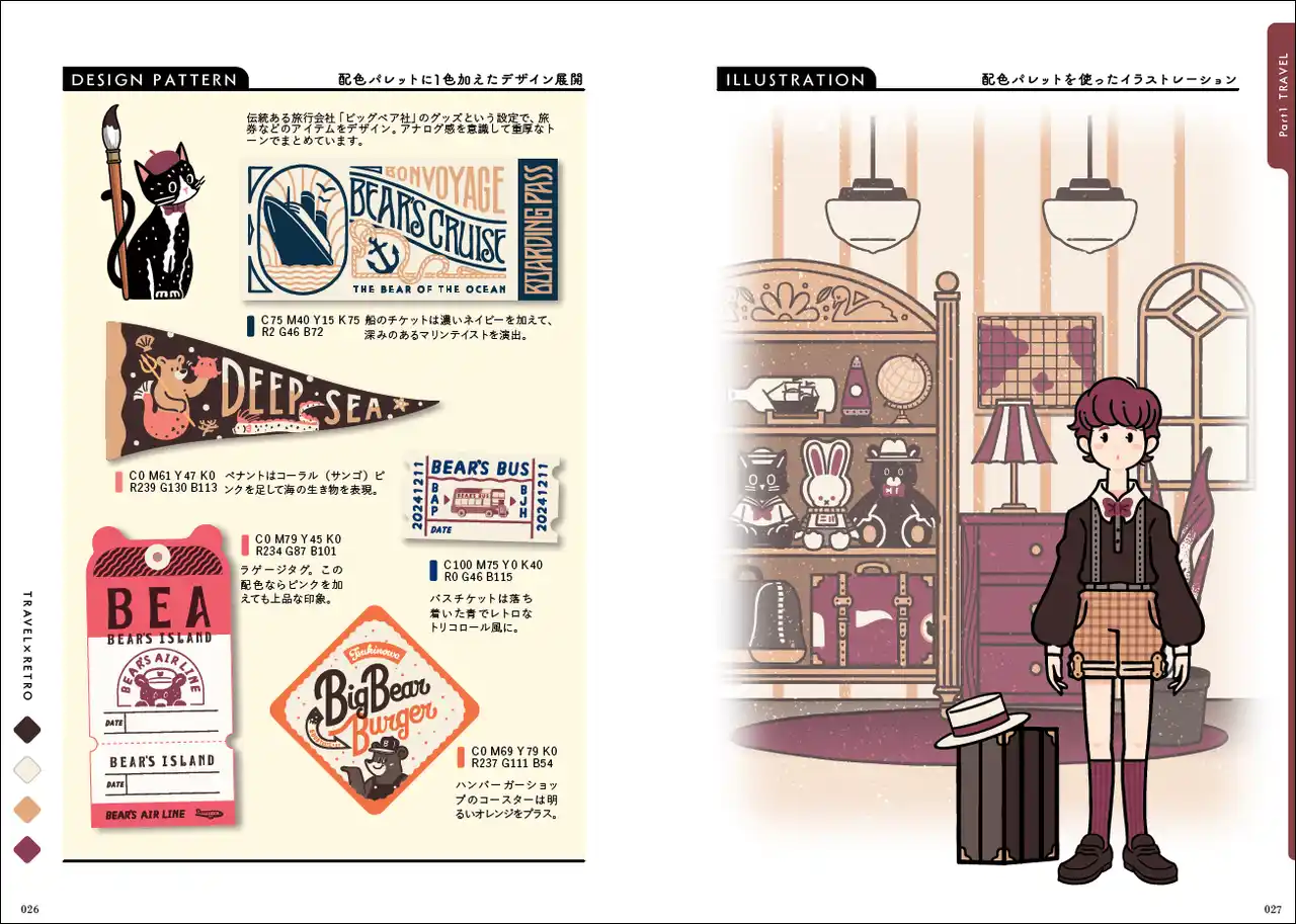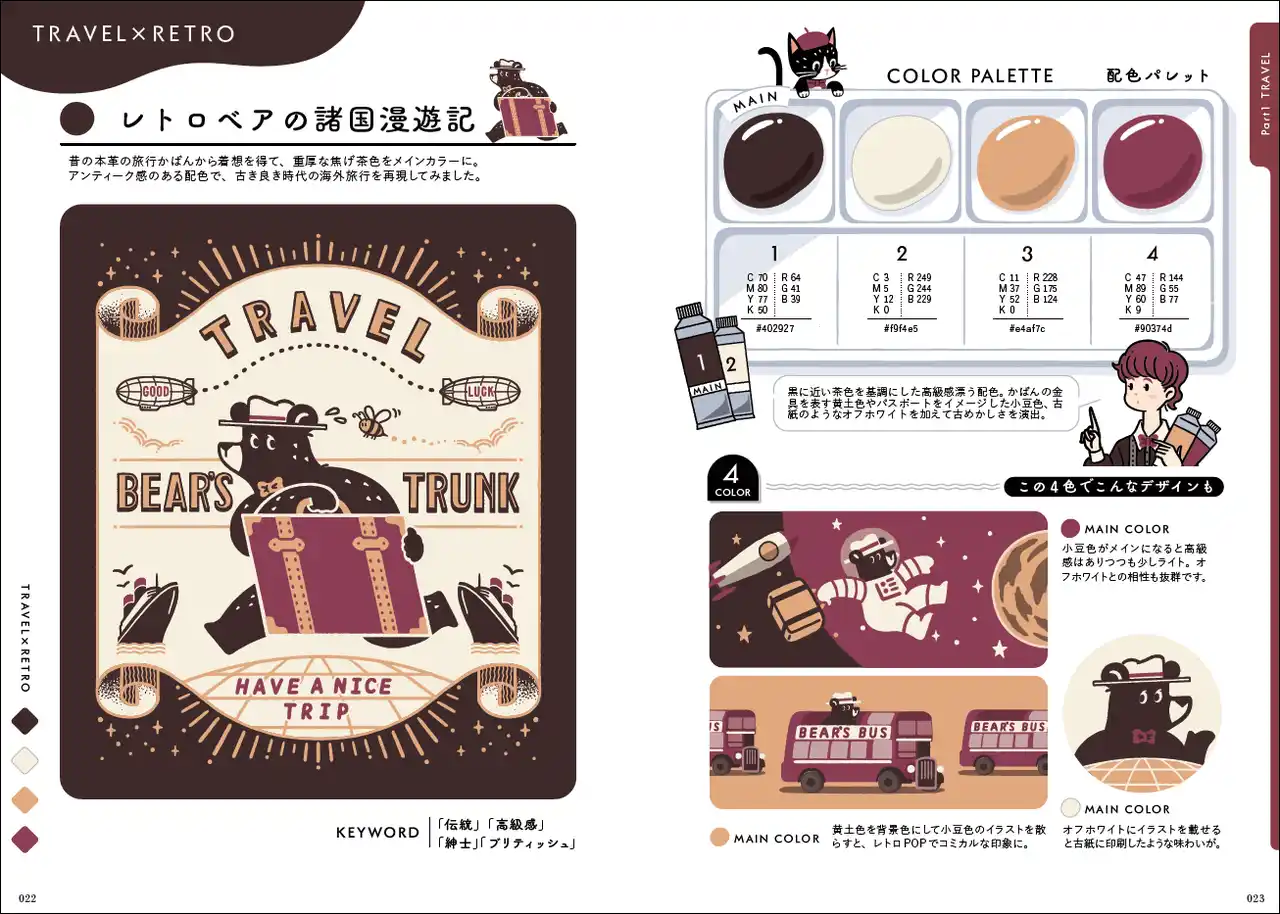 アジア中で大人気のかわいくてレトロなオシャレモチーフ×配色を、本書では「旅」「コスメ」「喫茶」「ステーショナリー」「ショップ」「レジャー」「グルメ」「謎解き」「イベント」の9つのテーマに合わせて、アイデアを3パターンずつ紹介しています。 |