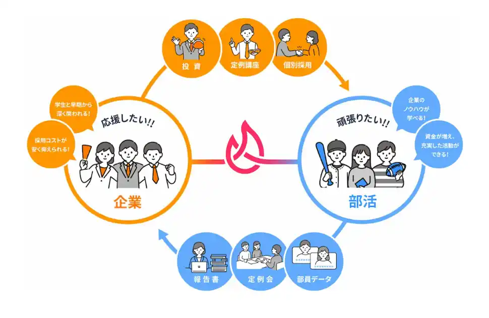 | 当社は、企業が大学の部活に対して、小口でスポンサー出資ができるサービス「SPONSORS BOOST」を展開しています。 「SPONSORS BOOST」は、企業が応援したい部活に対して小口支援することで、企業が部活の学生と早期接点が持つことが出来、採用にも活用できるサービスです。部活動支援を通じて企業ブランディングと学生接点を創出する新しい採用モデルとして、全国で導入が進んでいます。 | ||||||||||||||