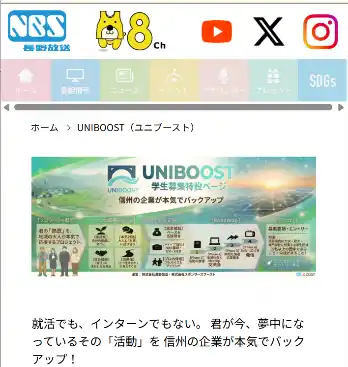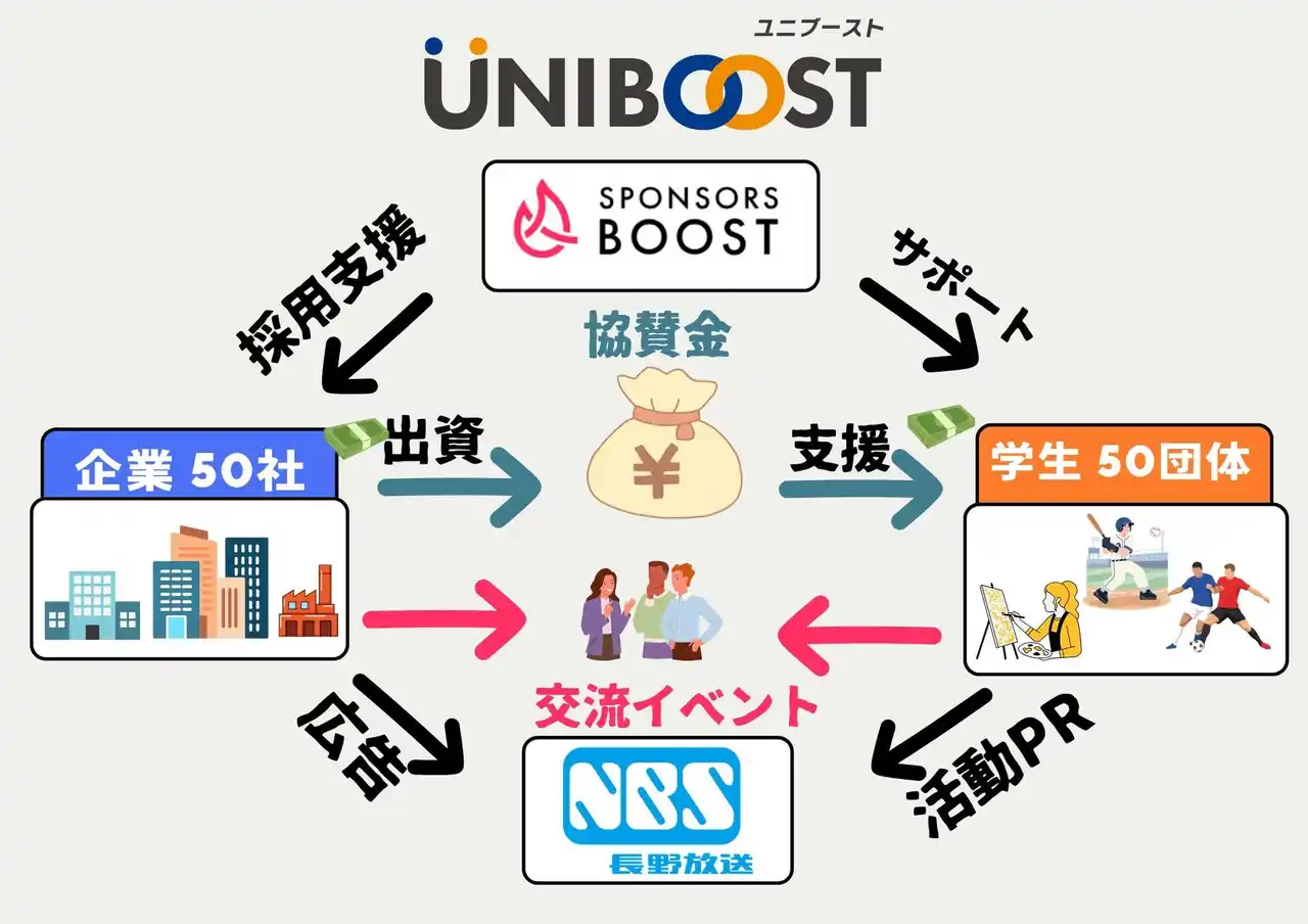 | 株式会社スポンサーズブースト(本社:東京都渋谷区、以下当社)は、株式会社長野放送(本社:長野県長野市、以下NBS)と連携し、長野県内の学生団体と企業をスポンサーという形でつなぐプラットフォーム「UNIBOOST」を開始します。 | ||||||||||||||