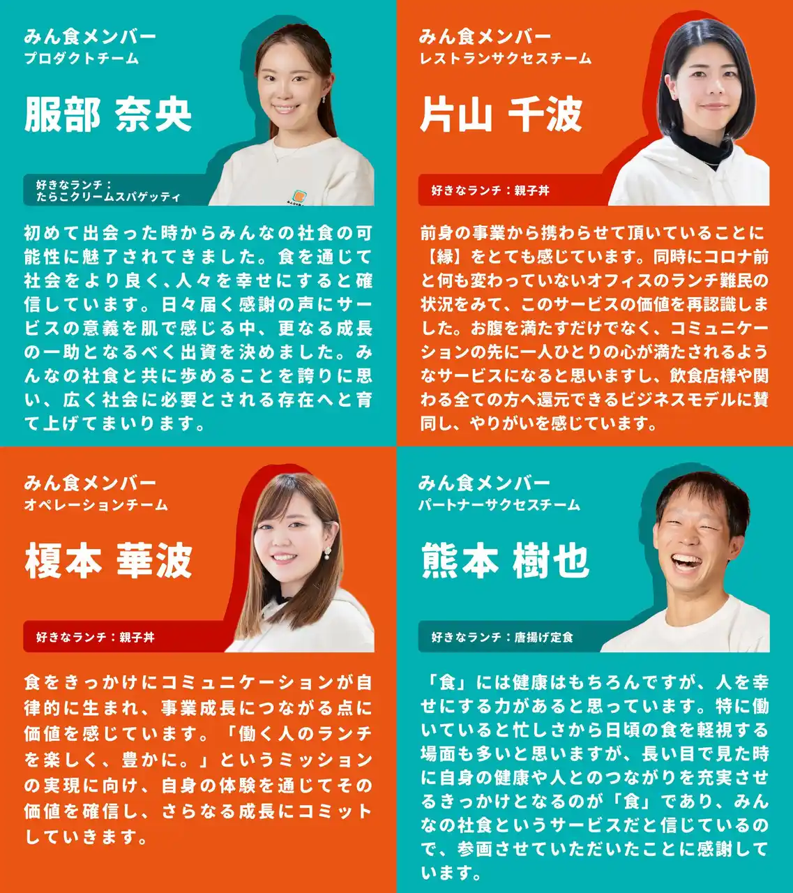 | 「みんなの社食」は働く人の食のインフラを目指しており、プラットフォームである以上、飲食店様・配送パートナー様・導入企業様、そして私たち自身のチームメンバーを含むあらゆるステークホルダーと共に創り上げていくものです。ありがたいことに、日頃から関わってくださる方々の中から「一緒に広げたい」「応援したい」と声を上げてくださる方が多くいらっしゃいました。 | |||