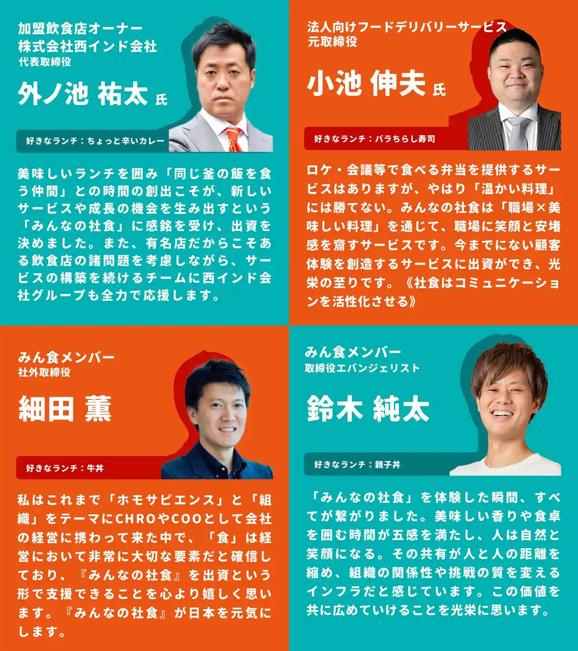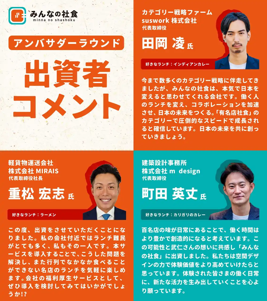 | 2025年6月のサービス開始以降、約半年で本導入のウェイティングが発生する程多くのお問い合わせをいただいている状況が続いています。しかし、私たちは規模の急拡大のみを追うのではなく、顧客体験に真摯に向き合い続けることを最優先にしたいと考えています。そのため、今回の資金調達は単なる資金的な支援ではなく、「みんなの社食」を支え広めたいという強い想いとともに名乗り出てくださった事業会社や個人投資家、そして自社従業員が引受先として参加するアンバサダーラウンドという形を選択しました。 | |||