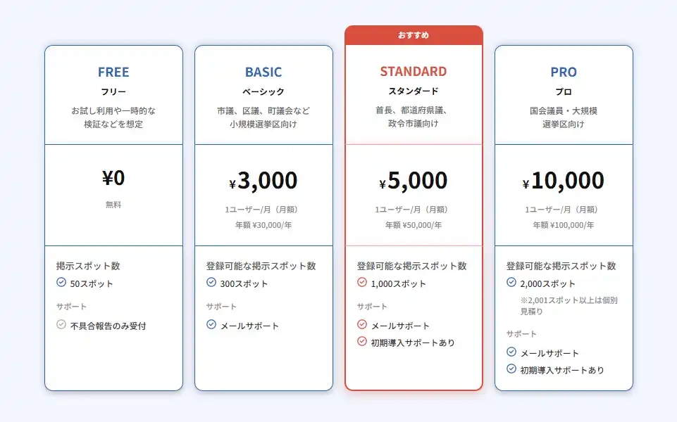 | ポスどこは活動規模に応じて選択しやすい料金体系を用意しています。議員の種類や政治活動の方法などによりさまざまなニーズが存在するため、これから選挙活動を始める新人候補者の方でも、ベテラン議員でも始めやすい価格体系を用意しております。 | |||