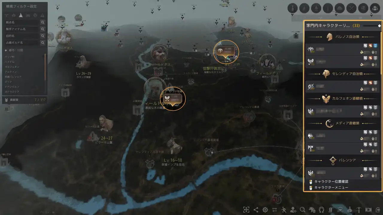 | 今回のアップデートではワールドマップ上で家門内のキャラクターをより簡単かつ直感的に管理できる機能が新たに追加されました。ワールドマップでキャラクターの場所をすぐに確認でき、位置を移動させたり、アイテムを移動させたり、覚えやすいように必要なメモを残すことも可能になりました。 | |||