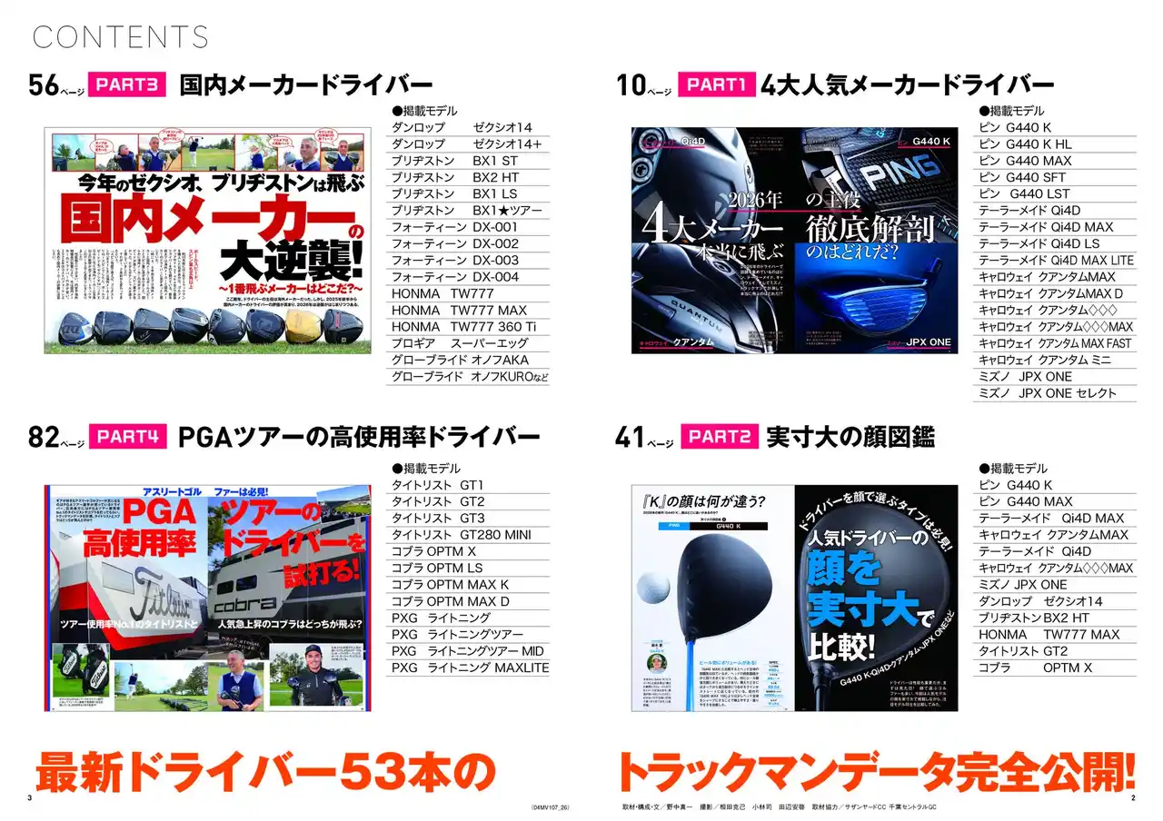 | 2026年に登場した新作ドライバーと、まだまだ人気のドライバーを弾道計測器「トラックマン」を使って計測し、ヘッドスピード別に測定したデータを一挙公開。いま欲しいドライバーの飛距離性能は? どのスペックを選べばいいの? という疑問に答える一冊に仕上がっています。 | |||||||||