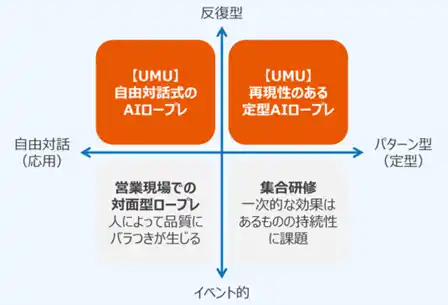 UMUのAIロープレでは、相手を用意しなくても練習できるいつでも、何度でも、同じ条件でロープレできるため、「時間が空いたら練習する」「うまくいかなかった点をすぐ試す」というサイクルが日常になります。ロープレが“イベント”から“習慣”に変わることで、学習量そのものが大きく変わります。 |