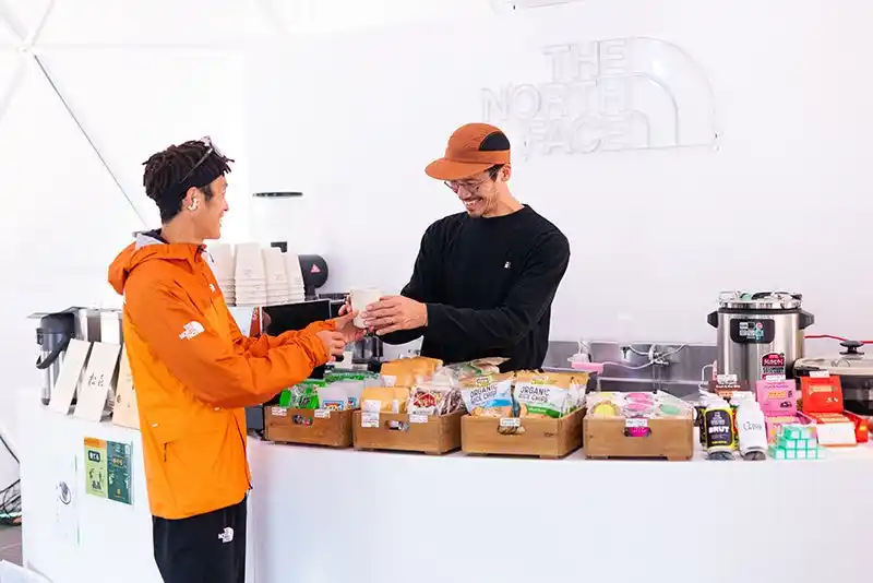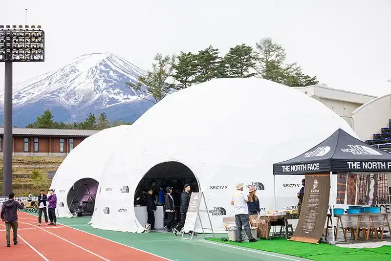 会場内に、物販およびカフェ機能を備えたザ・ノース・フェイスのドーム型テント(直径14m / 11m)を2張設置し、トレイルランニングシューズやランニングコレクションの販売、カフェメニューの提供を行います。カフェ内では、テーピング講座や環境保全に関するトークイベント、国内外の女性アスリートを囲んでドリンクを飲みながらコミュニケーションを楽しむWomen Athletes Meetupを実施します。 |