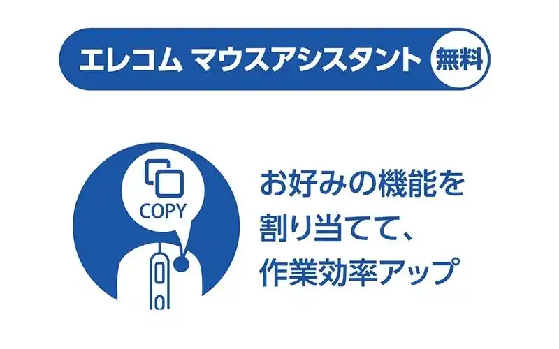 無料でダウンロードできるソフトウェア「エレコム マウスアシスタント」を使用することで、チルトを含む合計8ボタンによく使う機能などを割り当てられ、マウスを使った作業を効率化できます。 |