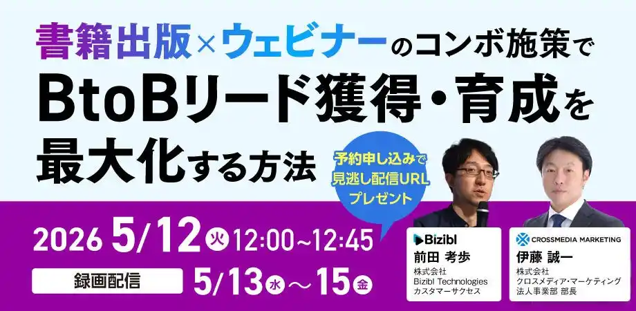 株式会社クロスメディア・マーケティング(本社:東京都渋谷区 代表取締役:小早川 幸一郎)は、株式会社Bizibl Technologies(本社:東京都千代田区、代表取締役:花谷 燿平)が2026年5月12日(火)から5月15日(金)に開催するウェビナー「書籍出版×ウェビナーのコンボ施策でBtoBリード獲得・育成を最大化する方法」に登壇いたします。 事前にお申し込みいただいた方には、期間限定の見逃し配信のご案内を予定しています。リアルタイムでのご参加が難しい方も、ぜひお申し込みください。 |