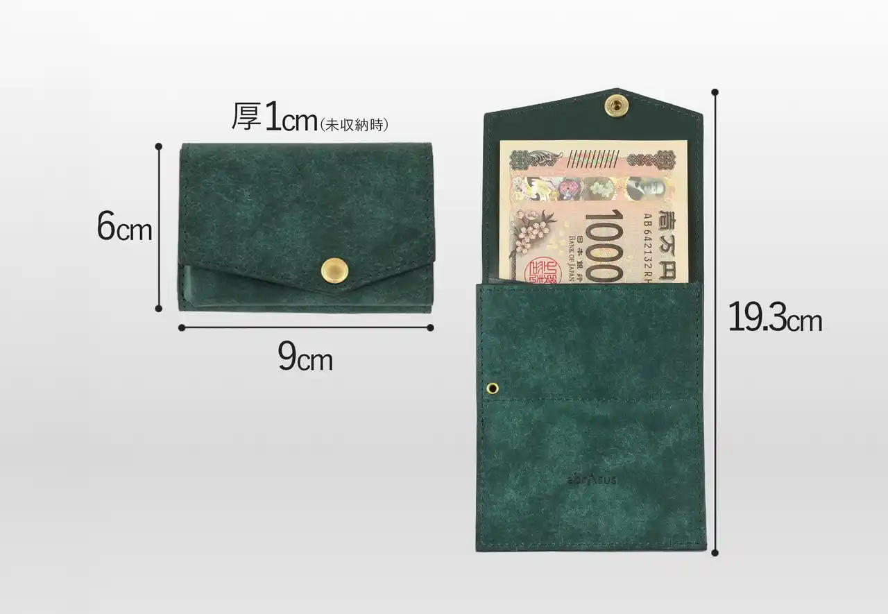 アブラサスの「小さい財布」は、縦約60mm × 横約90mm × 厚さ約10mm(未収納時)というカードサイズの極小設計が特長です。このサイズでありながら、カードサイズを実現する独自の接続パーツ構造(特許取得済み)や、コインケース、カードケースを効率的に配置し、使いやすさを徹底的に追求しました。グッドデザイン賞も受賞しており、その機能美は高く評価されています。 |