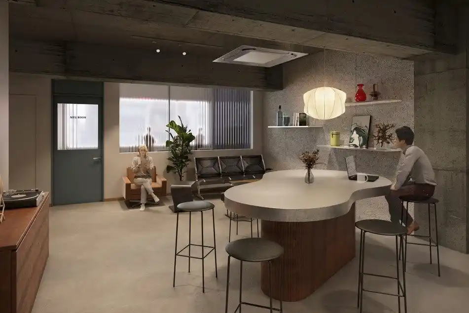 インダストリアルな質感とミニマルなインテリアで構成されたラウンジスペース。 コーヒーを片手に一息つきながら、個人ワーク、チームでのブレスト、来客時の打合せなど、さまざまなシーンにフレキシブルに対応します。入居者同士が自然に交流できる設えとすることで、何気ない会話や偶然の出会いを育み、新たな発想やつながりを生み出す場となっています。 ※同フロアには、8名用会議室とWEB会議に適したフォンブースも完備しています。 |