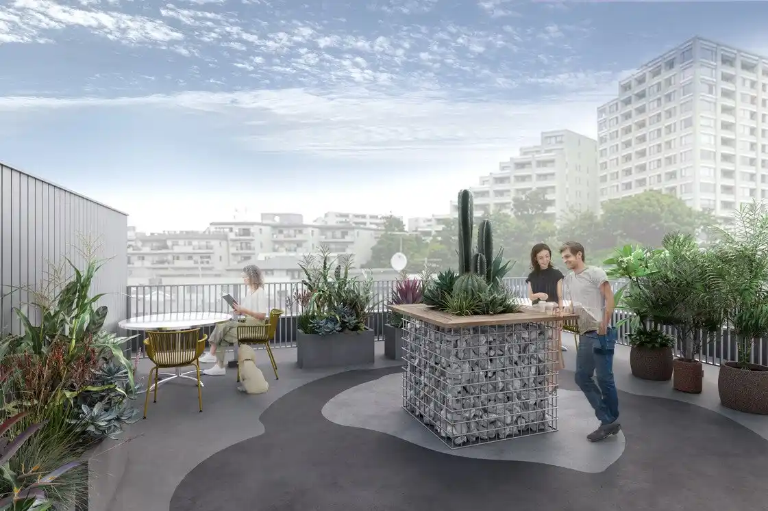 | 緑道を望む、開放的なルーフトップテラス。風や自然光を感じられる屋上空間として、中央に配したガビオンを囲みながら、自然な会話や新たな交流が生まれる、心地よい場となっています。 | |||