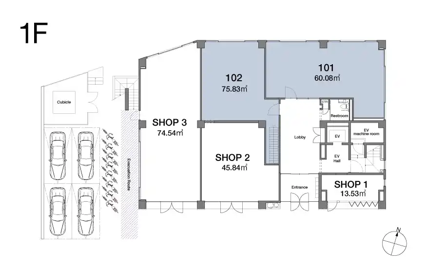 | 1Fならではのスムーズなアプローチと、天井高3.6mのゆとりある空間を活かしたショールーム兼オフィス区画。自社プロダクトの展示や商談、オープンなワークプレイスなど、企業の個性や利用目的に合わせた柔軟な運用に対応します。専用の地下フロアを備えた102区画は、1Fと地下を使い分けることで、撮影スタジオなど多様な用途での活用も可能です。 | |||