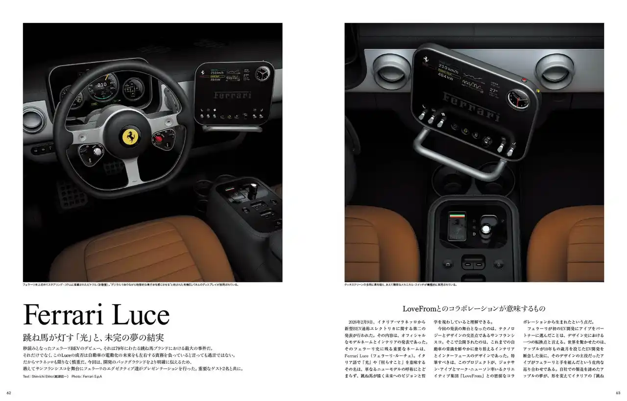 151号となる2026年春号では表紙と特集に849テスタロッサの試乗記事を収録。スペインの一般公道とサーキットでジャーナリストの西川淳氏がその走りをリポートしています。またデビューしたばかりのアマルフィ・スパイダーをグラビアで紹介。またフェラーリのEVとして注目されるLUCEの室内ディテールの様子、デザイナチームを収録しています。 |