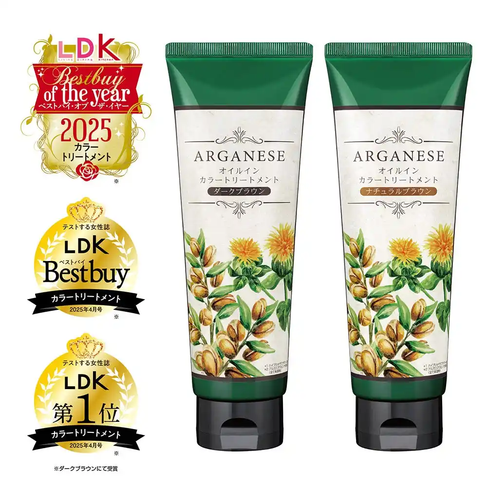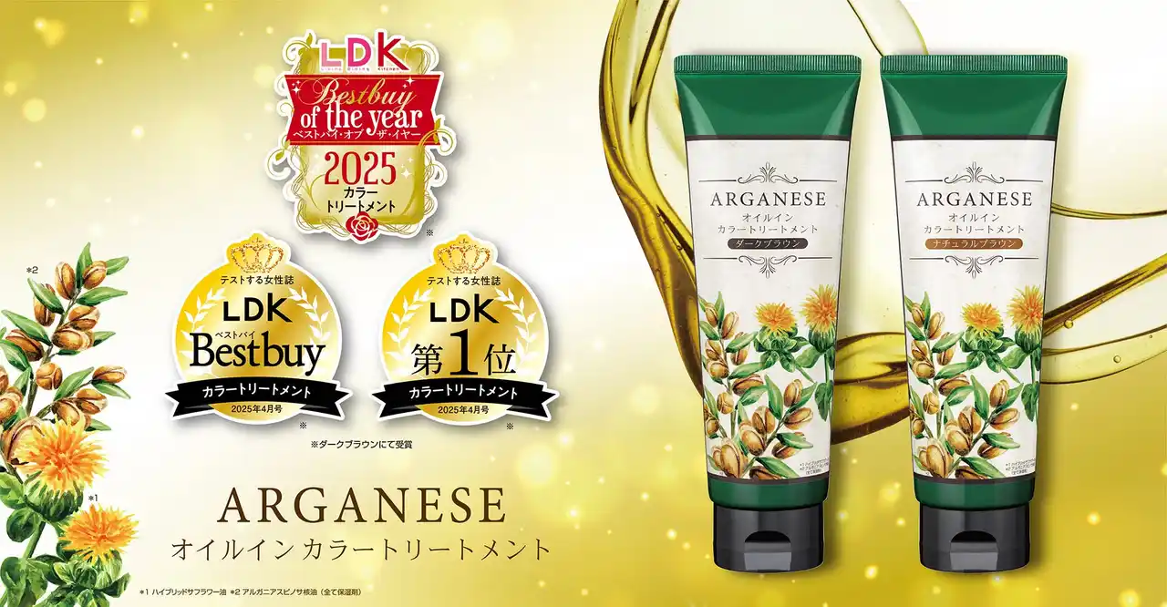 白髪ケアアイテム「アルガネーゼ オイルインカラートリートメント ダークブラウン」は、テストする女性誌『LDK』(株式会社晋遊舎)2025年4月号にて、カラートリートメント部門の「第1位」および「ベストバイ」を受賞。さらに、同誌2026年1月号では「LDK ベストバイ オブ・ザ・イヤー 2025」のカラートリートメント部門に選出され、あわせて3冠を達成いたしました。仕上がり、成分、使用感のすべてにおいて高い評価を獲得しており、その確かな品質と実力に注目が集まっています。 |