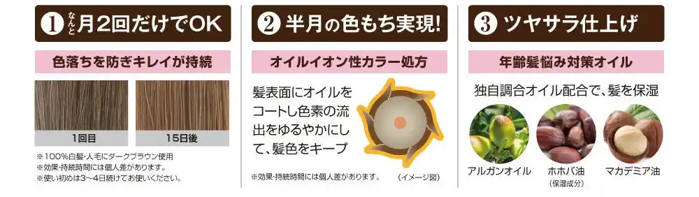 気になる白髪を補修しながらしっかりと染め上げ、最大で15日間髪色が長持ちします*。 |
