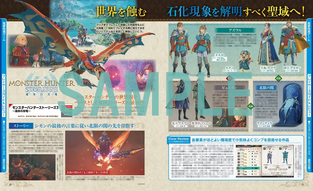 『モンスターハンターストーリーズ3 ~運命の双竜~』(カプコン)の特集では、10ページに渡って、ストーリー/キャラクター/フィールド/オトモン/バトルの5つのカテゴリ別に徹底解説! |