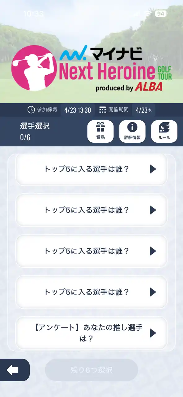 イノベーションの力で新たなスポーツ・エンターテインメントを創造し、まだ見ぬ感動と熱狂を提供するアプリ「なんドラ」を運営する株式会社UPSIDE SPORTS ENTERTAINMENT(本社:東京渋谷区、代表:森井啓允)は、2026年4月22日(水)~23日(木)にグレートアイランド倶楽部(千葉県)で開催される、マイナビネクストヒロインゴルフツアー『第3戦 CREATION DREAM CUP』の成績トップ5の選手と優勝選手の予想企画を開催します。 |