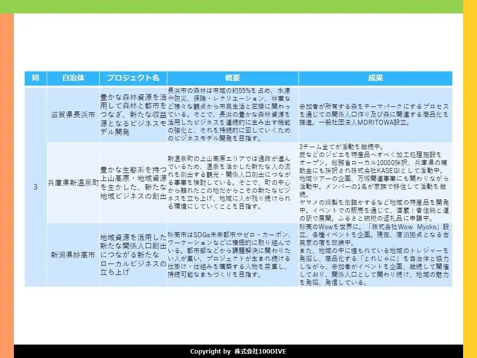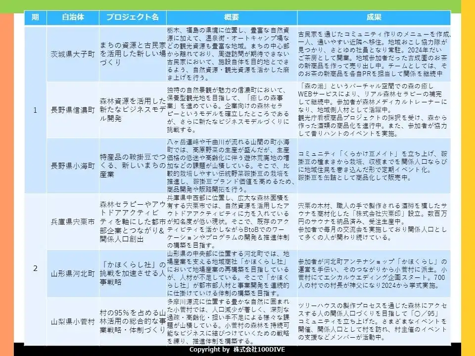 100DIVEでは、2021年から11期24の地域で実施し、368名が参加。30チームが活動を継続し、8つの事業が法人化を実現しています。地域やチームごとの取り組み内容、事業化の進捗なども含めて、”100DIVEのこれまで”を下記の画像にまとめております。 |