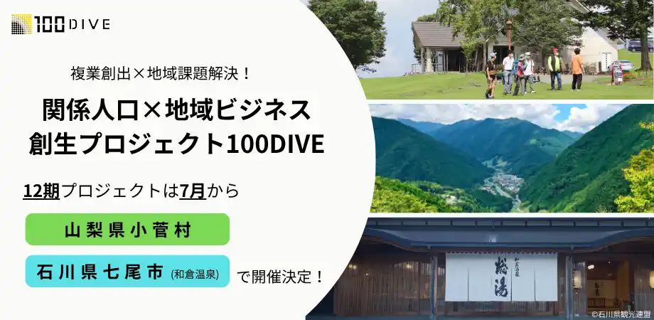 「100DIVE」第12期となる今回は、山梨県小菅村・石川県七尾市(和倉温泉)を舞台に開催。 |