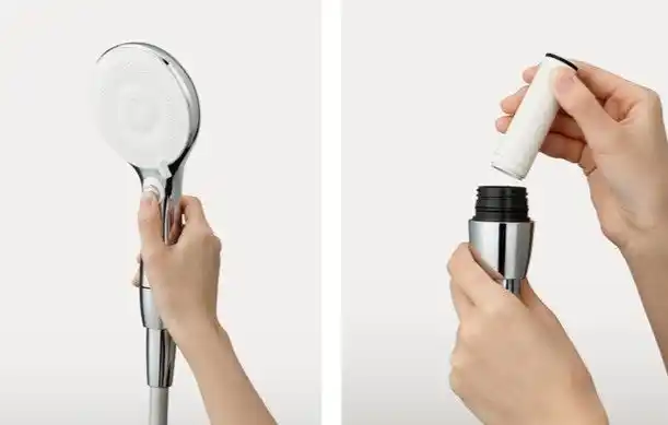 グリップ部分にセットする「浄水カートリッジ」で髪のパサつきや、肌のピリピリ感の原因といわれている水道水に含まれる残留塩素を除去。髪にもお肌にもやさしい水をつくります。手元のボタンで簡単に浄水・原水の切り替えが可能です。 |