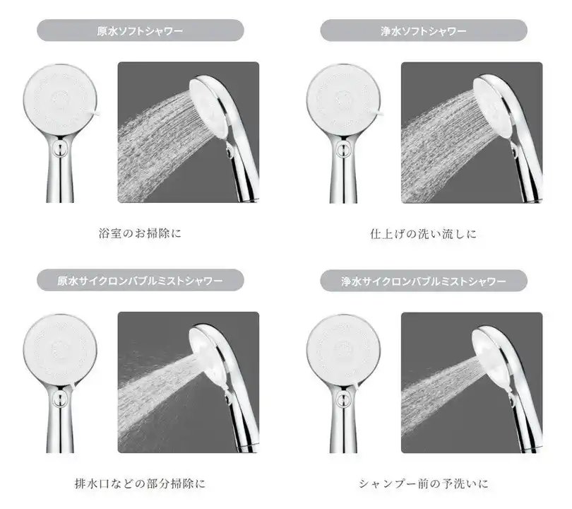 サイクロンバブルミストシャワー/ソフトシャワー、それぞれの原水/浄水と、計4つの水形をスライド操作で簡単に切り替え可能。シャンプー前の予洗いや仕上げの洗い流し、浴室のお掃除など、使用シーンに合わせて、最適な水形をお使い分けいただけます。 |