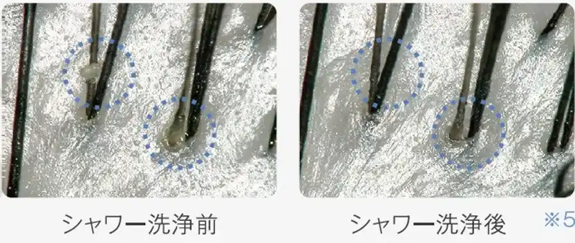 (2025年10月28日第三者機関にて測定)。水質・環境・ 時期により数値は変動します。※3・・・社内検証を再現したイメージ動画です。※4・・・ キレイストシャワープラスのソフトシャワーの水形(穴径40.45mm・穴数222個)と当社従来型シャワー品:JSA021/キモチイイシャワーWS (穴径40.3mm・穴数351個)を使用し、静水圧0.2MPaで60秒間吐水した際の流量を比較した結果 (2026年1月タカギ調べ)※5・・・シャワー前後の毛穴周辺の頭皮・毛髪のイメージ画像※6・・・イメージイラスト |