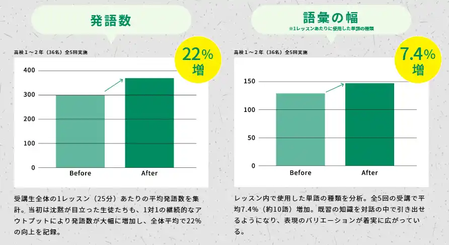 検証の結果、受講生全体(高校1~2年生 36名、全5回実施)の1レッスン(25分)あたりの平均発語数が22%増加、さらに1レッスン内で使用される単語の種類(語彙の幅)も平均7.4%(約10語)増加するという成果を記録しました。 |