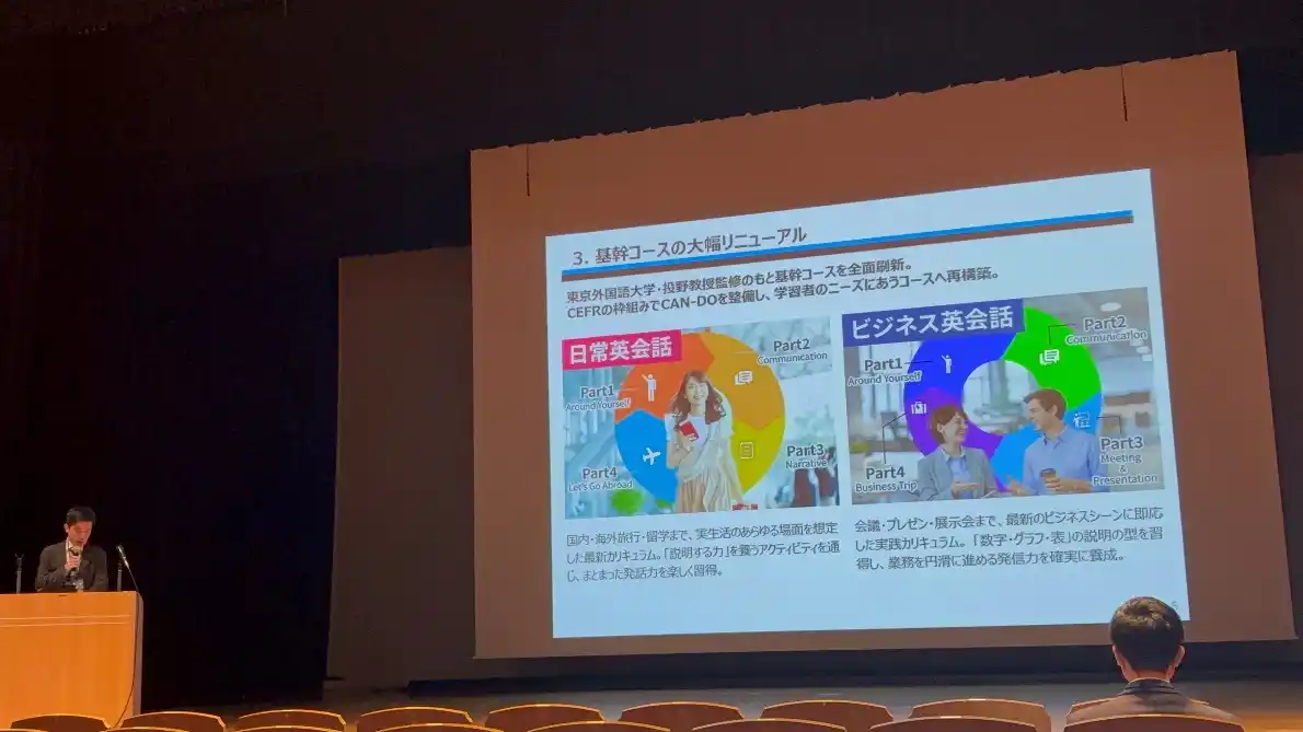 当日の企業プレゼンでは、当社の教務部門責任者の六波羅 人聖(ろくはら じんせい)が登壇し、投野教授の改訂監修を受けた「日常英会話」および「ビジネス英会話」の再構築プロジェクトにおける商品設計プロセスを解説いたしました。教材開発にあたっては、プロジェクトを通じて開発された『CEFR-J Grammar Profile』等のリソースを精査し、A1~B2の各レベルを4つのカテゴリーへ体系化。全レッスンに当社独自の「Can-do」を設定するなど、現代の学習者の実態に即した開発指針を提示しました。 |