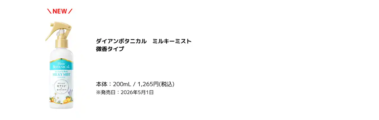 株式会社ネイチャーラボ(本社:東京都渋谷区)は、「やさしさを信じる、生き方がいい。」をコンセプトに展開している『ダイアンボタニカル』より、全身使えるボディミストを2026年5月1日(金)より全国発売いたします。 |