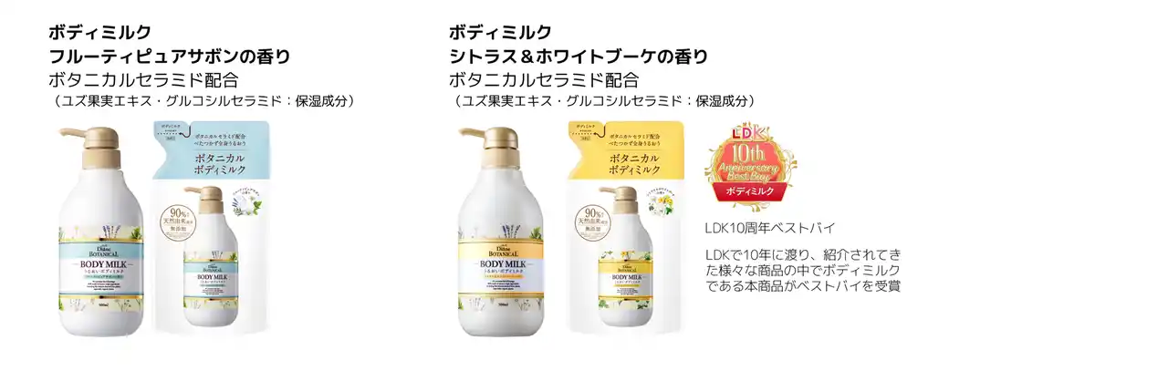 自然にも自分にもやさしいダイアンボタニカルならではの「10種のオーガニックボタニカルエキス※6」や「8種のレアオイル※7」はそのままに、ユズ・コメ・パインの3種のボタニカルセラミド※3を配合した全身用乳液ミスト。 |