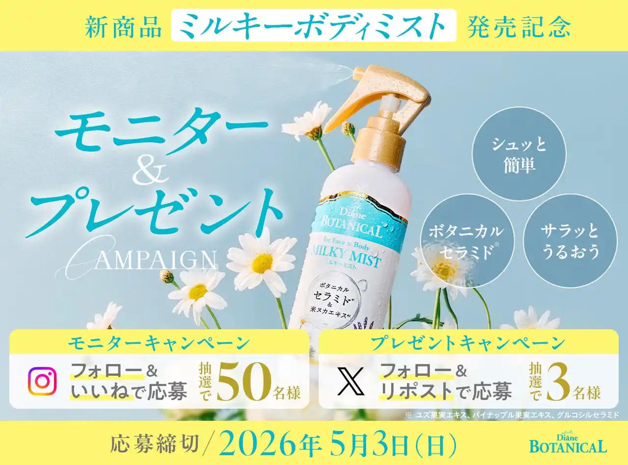 発売を記念して、ダイアンボタニカルの公式InstagramとXにて、本商品(ダイアンボタニカル ミルキーミスト)が抽選で当たるキャンペーンを実施いたします。 |